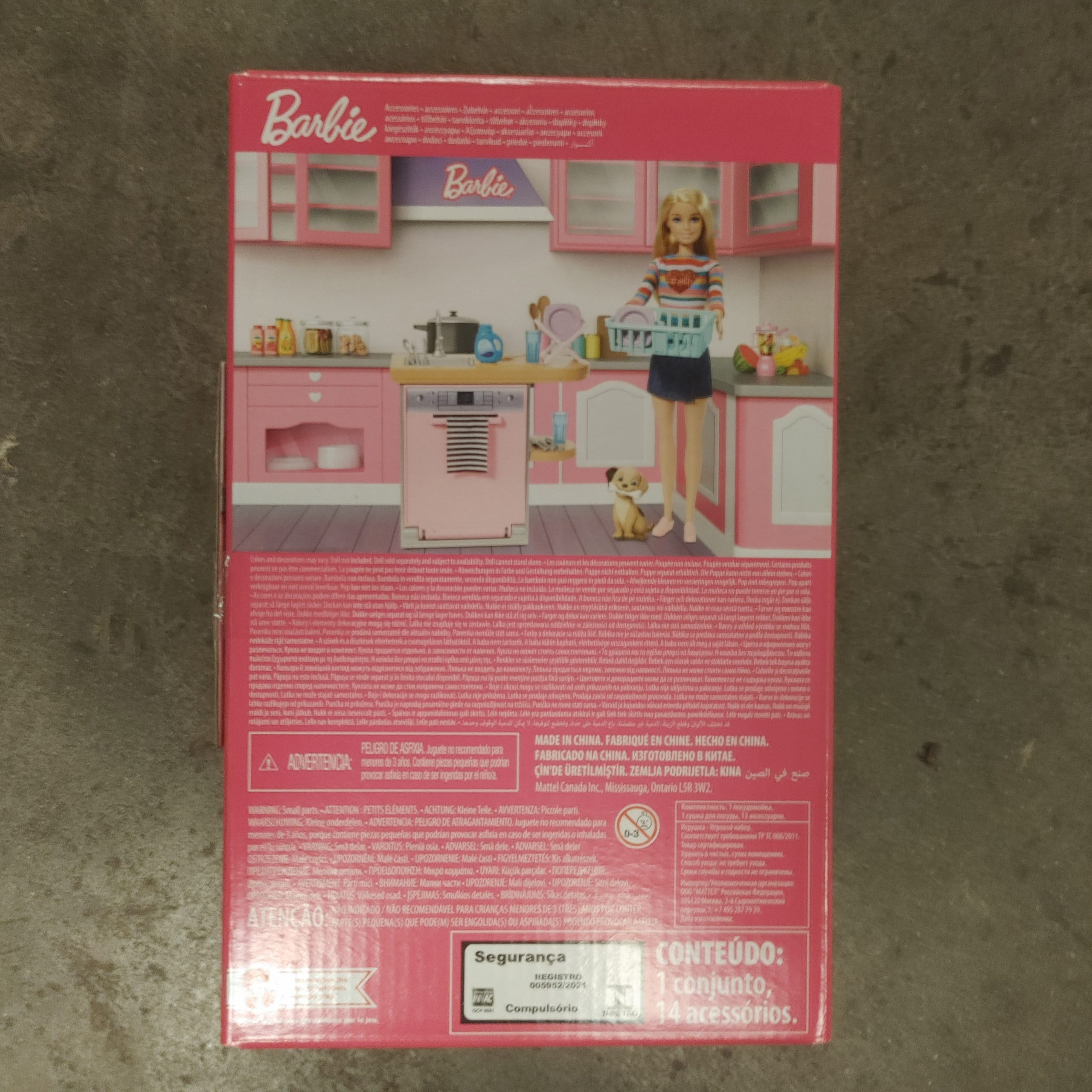 - Kids can get their imaginations rolling with some kitchen cleaning! This Barbie accessory pack includes a piece of furniture and assorted décor items.