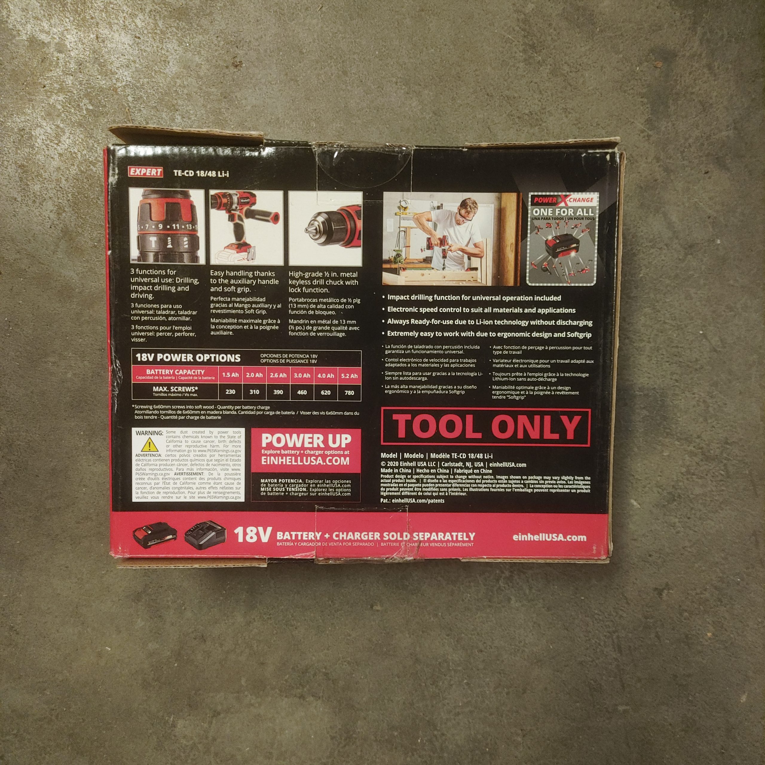Thanks to Einhell’s Power X-Change Technology, TE-CD 18/48 Li-I is ready for action when you are thanks to its discharge resistant battery power. TE-CD 18/48 Li-I delivers up to 390 lbs-in of force with an impact rate of up to 24,000 BPM, and thanks to its ergonomic soft grip guarantees comfortable work no matter how long the job runs.