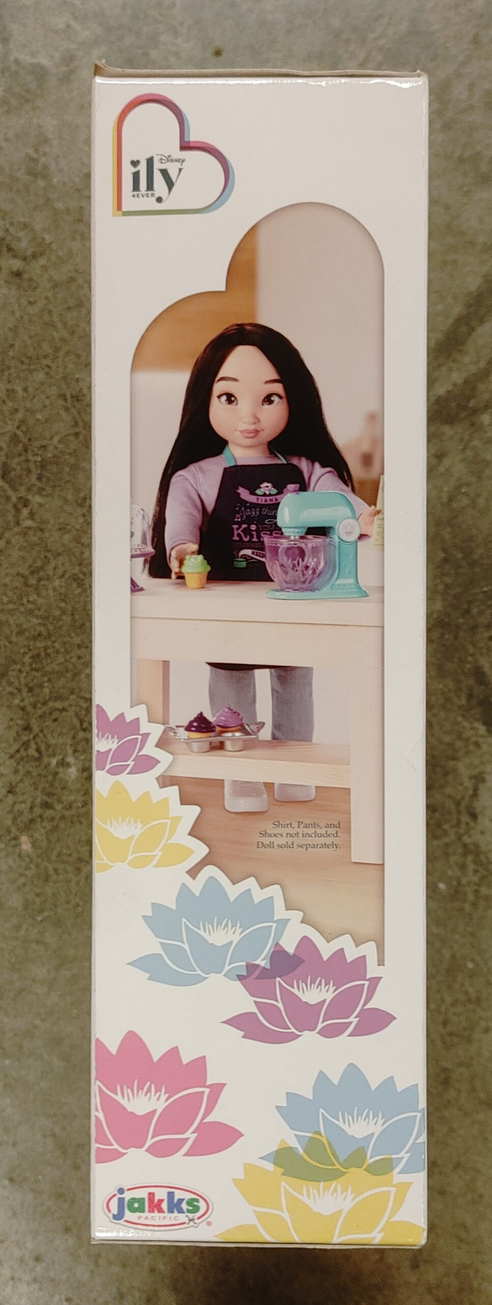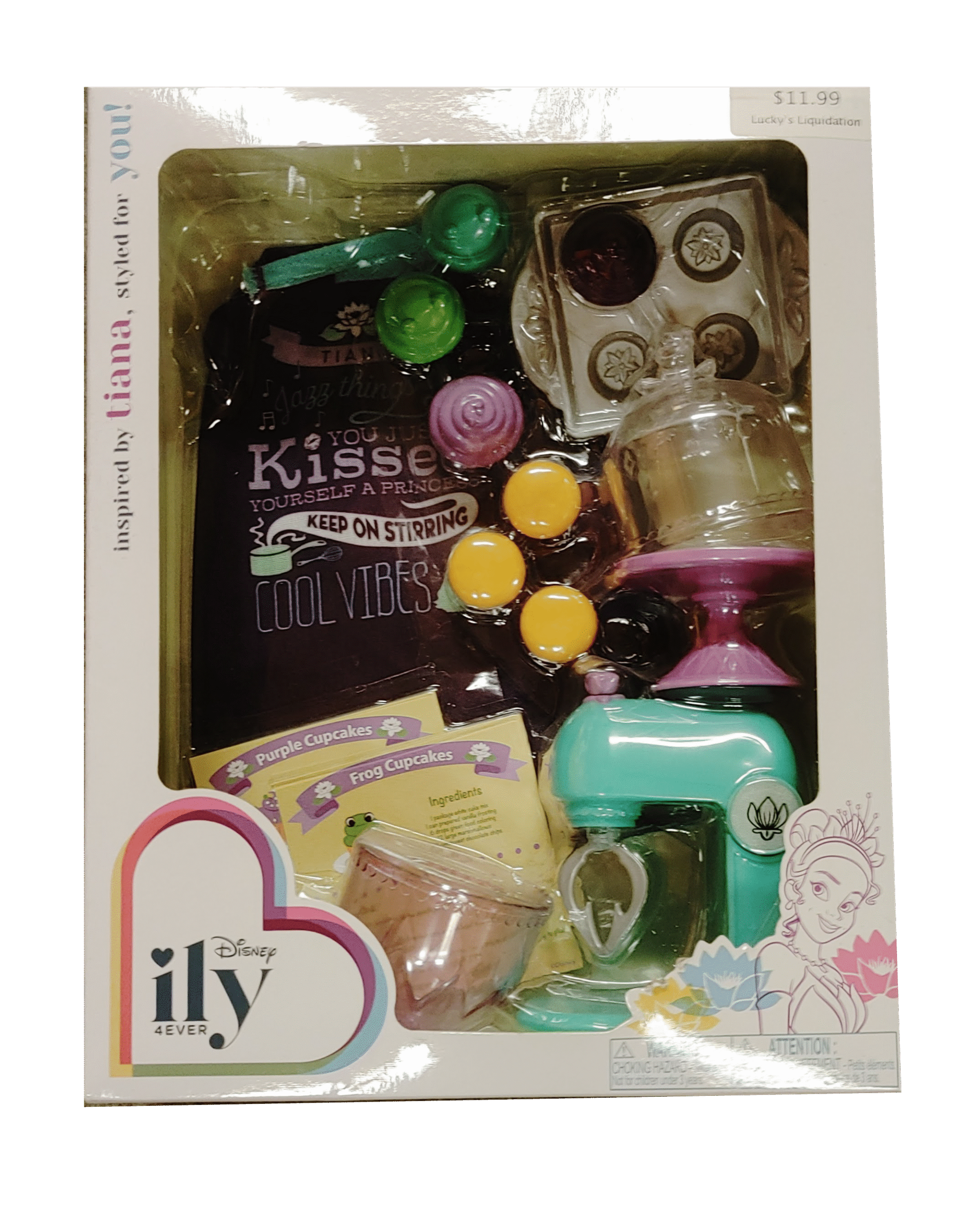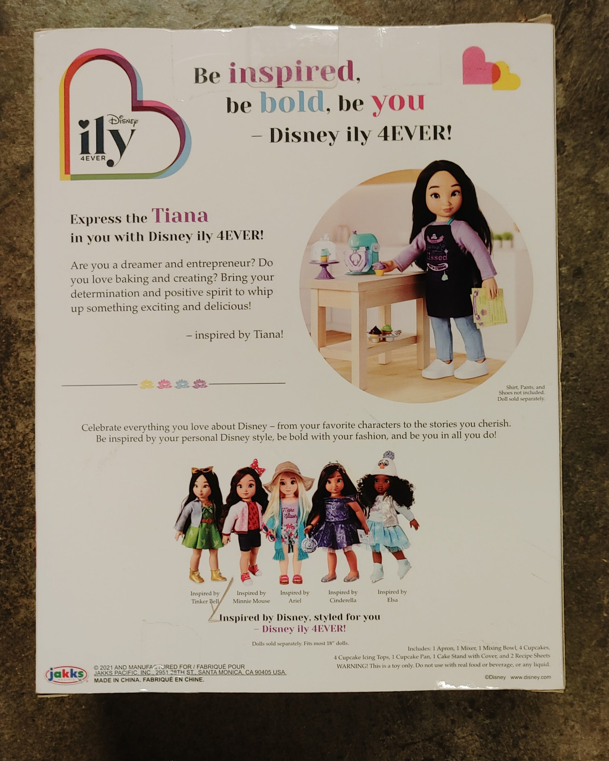 Disney ily 4EVER is an 18-inch doll brand inspired by beloved Disney stories and characters. It includes a line of dolls, trendy fashions and aspirational accessories that celebrate everything kids love about Disney. Inspired by characters such as Ariel, Minnie Mouse, and Tinker Bell, and themes such as outdoor activities and culinary arts, this line combines the best of Disney with the latest fashions and must-have accessories! Inspired by Tiana, this Disney ily 4EVER baking set will have your 18-inch doll whipping up delicious treats! Put on the apron and get your doll ready, it’s time to make some yummy cupcakes. This detailed baking set features a manual working mixer with mixing bowl, a cupcake pan, and four cupcakes. Put the finishing touch on the cupcakes using the colorful icing toppers and place your favorite on the cake stand for display. Included are two recipe cards for real baking fun! Accessory set is shown on Inspired by Tinker Bell doll and is compatible with most 18-inch dolls.
